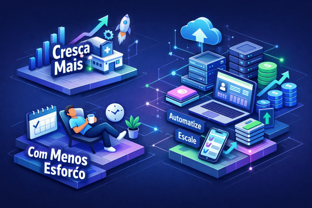 Cada uma das 9 estratégias aqui funciona de forma independente. Mas o maior salto acontece quando elas trabalham juntas: automação libera tempo, CRM organiza vendas, time treinado executa, KPIs mostram o que ajustar. O resultado é um consultório que cresce sem que o dono precise estar em cada etapa, que é exatamente o que você precisa para escalar seu consultório sem trabalhar mais.